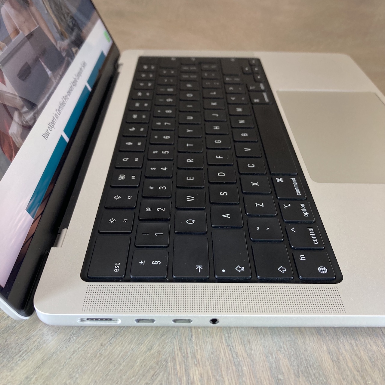 Connectivity is comprehensive with Wi-Fi 6, Bluetooth 5, three Thunderbolt 4 (USB-C) ports, HDMI 2.0, an SDXC card slot, a 3.5mm headphone jack, and a MagSafe 3 charging connector.
